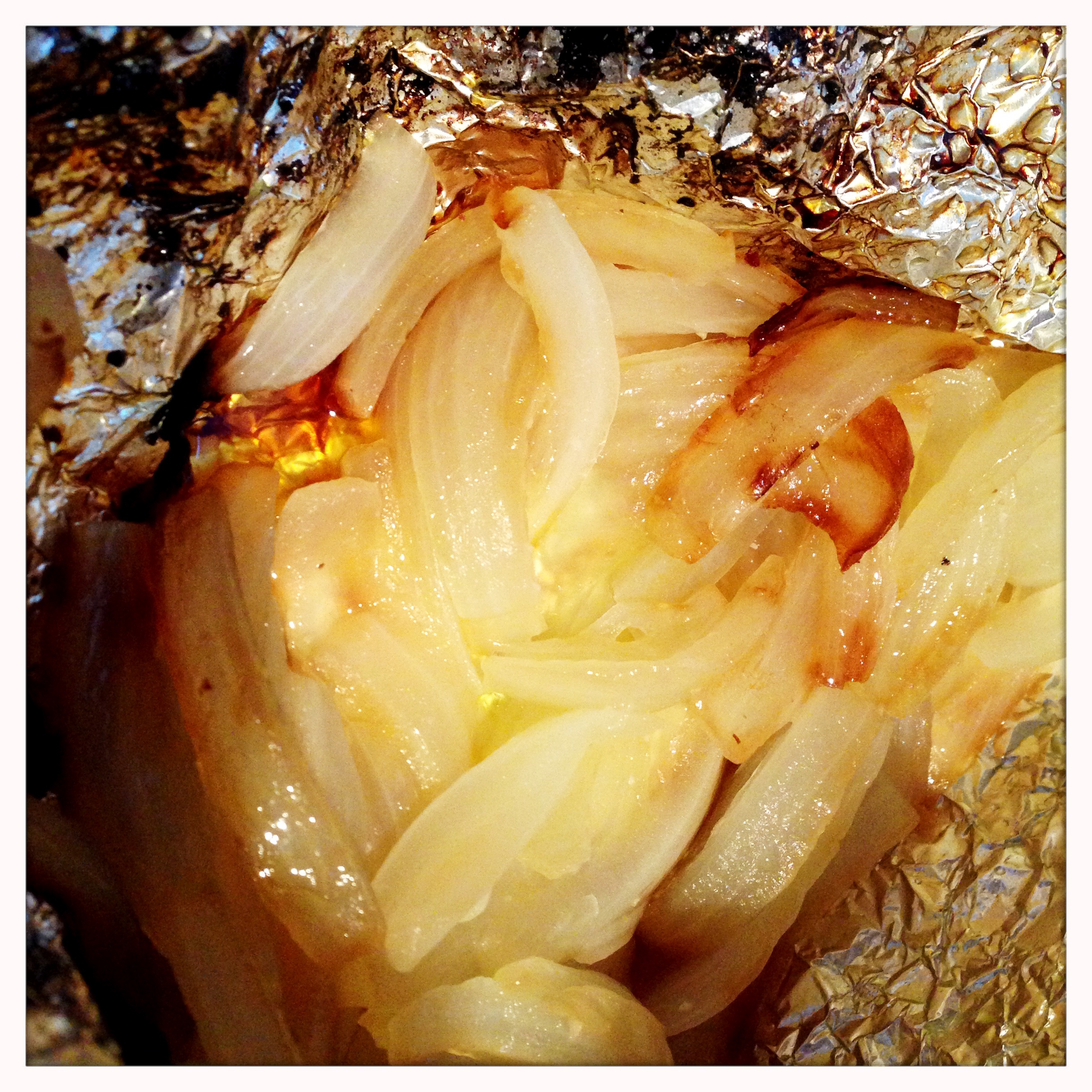 Once everything is grilled to your liking, it’s time to assemble your burgers. Open the onion packet carefully as it will be very hot and steam will escape when you break it open.