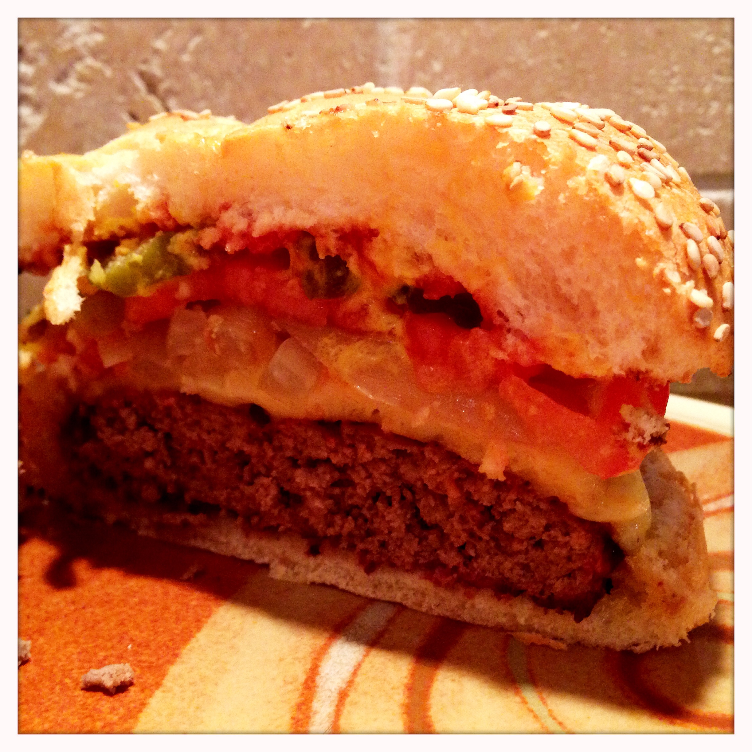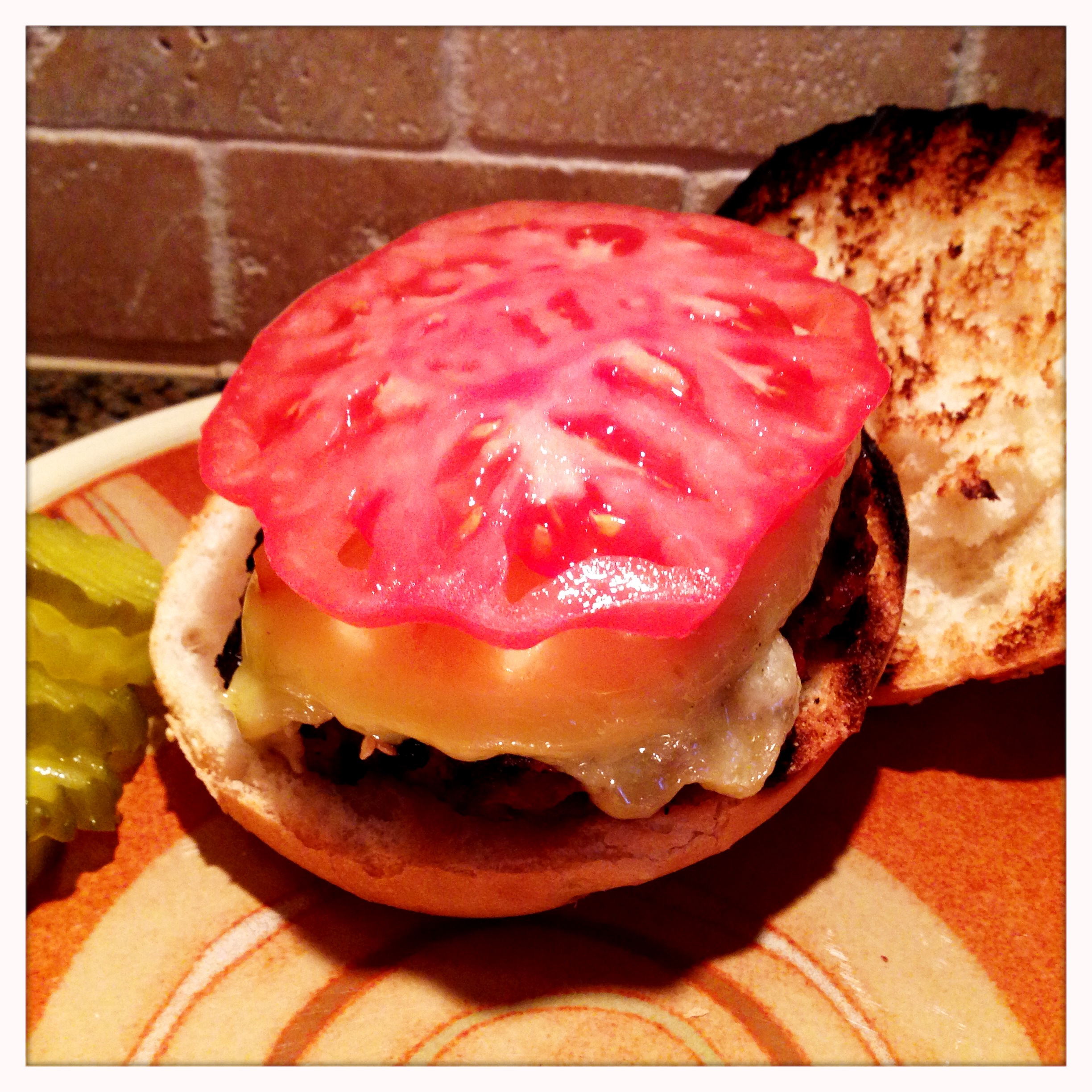 Top the burger with the toppings of your choice. If you can find them, large heirloom or beefsteak tomatoes take to slicing very well.