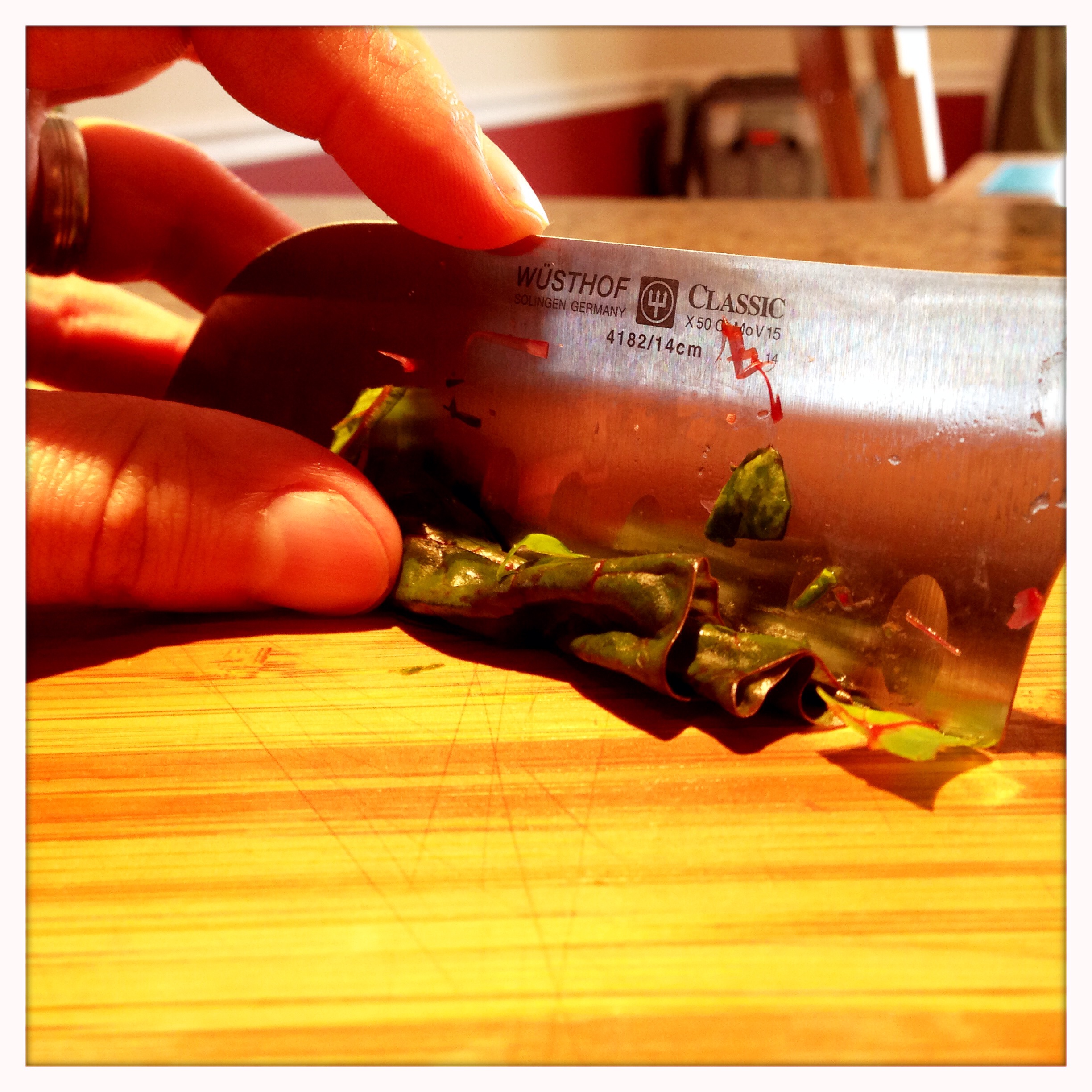 For the leaves, we’ll be looking for small, bite sized pieces that will be easy to distribute throughout the pasta. The easiest way to quickly chop up these large leaves is by rolling them. First roll a leaf into a tight roll, and then slice lengthwise through the roll.