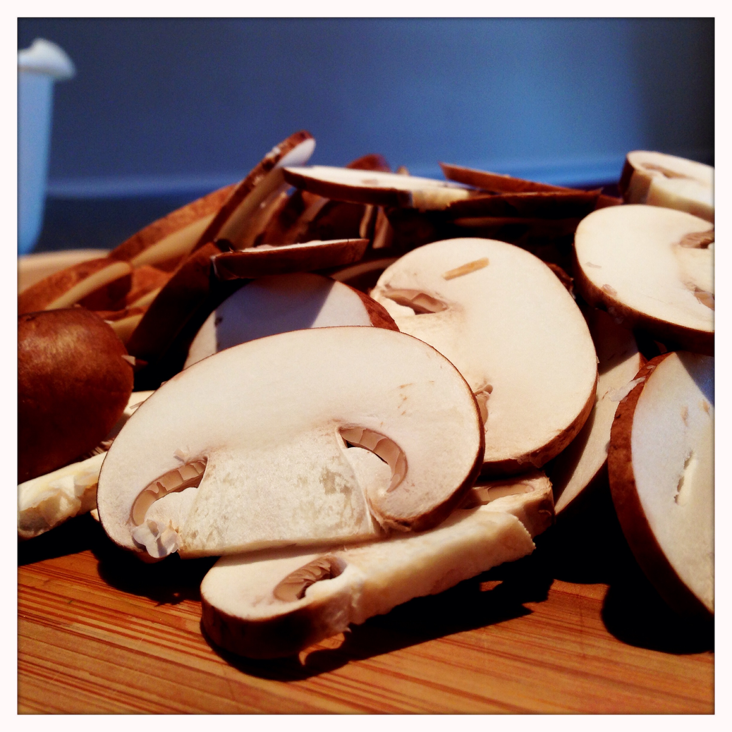 Chop the onion. Slice the zucchini into thin rounds, and thinly slice the mushrooms as well. You can use large slices of mushroom to create a heartier texture, if you prefer. I think the thin slices worked very well here, though.