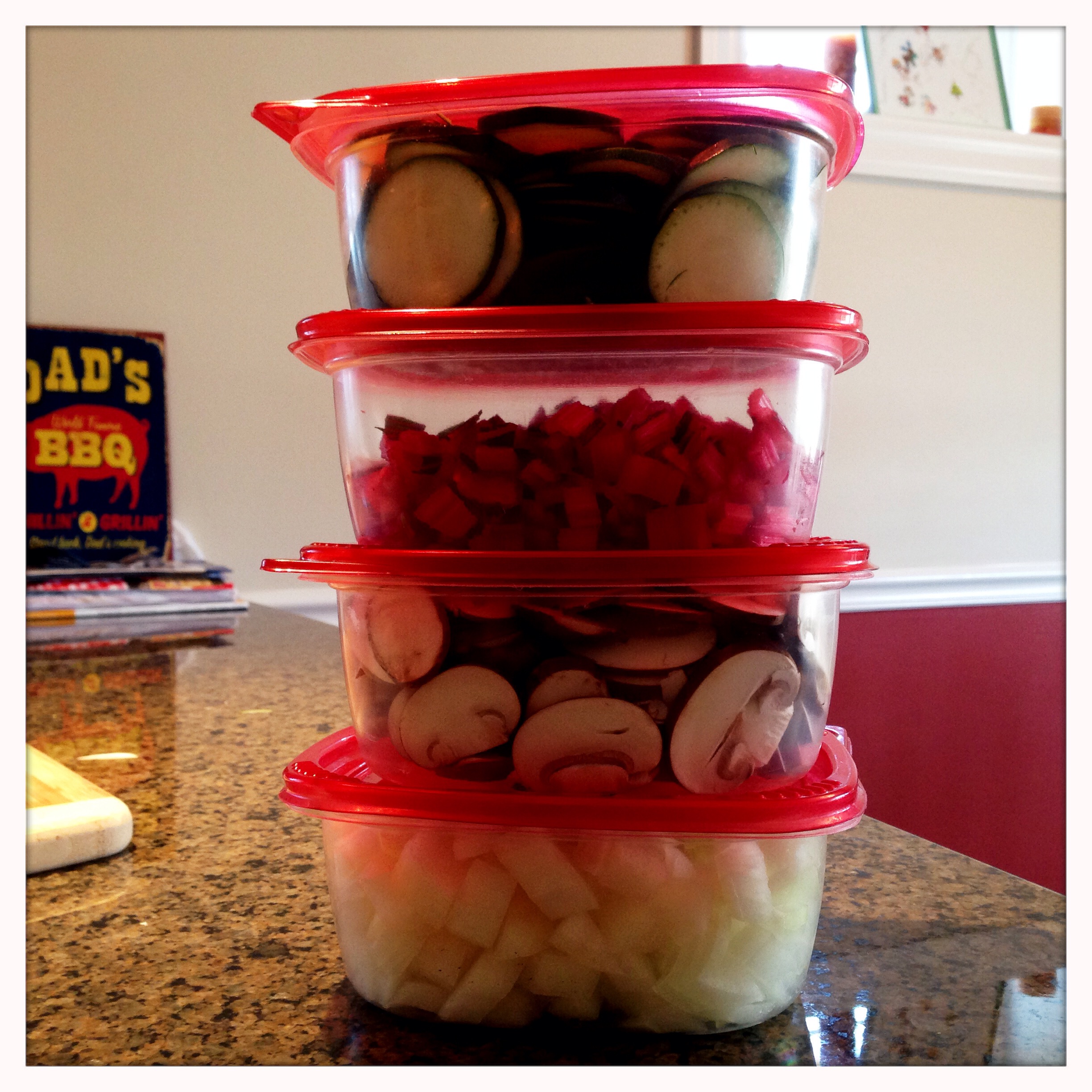 For convenience while cooking, I cut up all the veggies and put them into plastic containers so they could be easily added to the pan when needed.