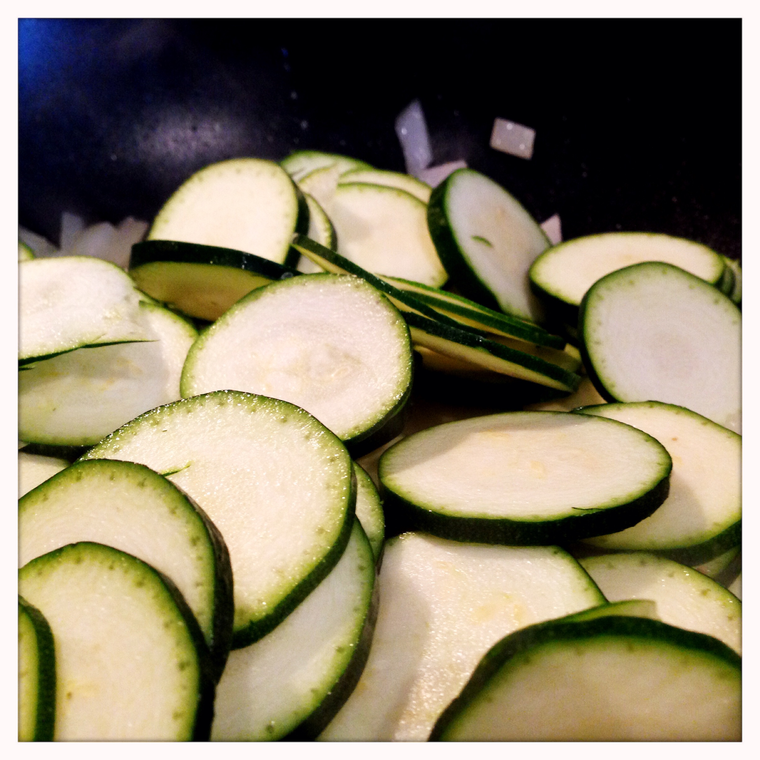 Now that everything is prepped, it’s time to get cooking. Heat some olive oil in a pan, and saute the onions until they start to soften. Then add the zucchini.