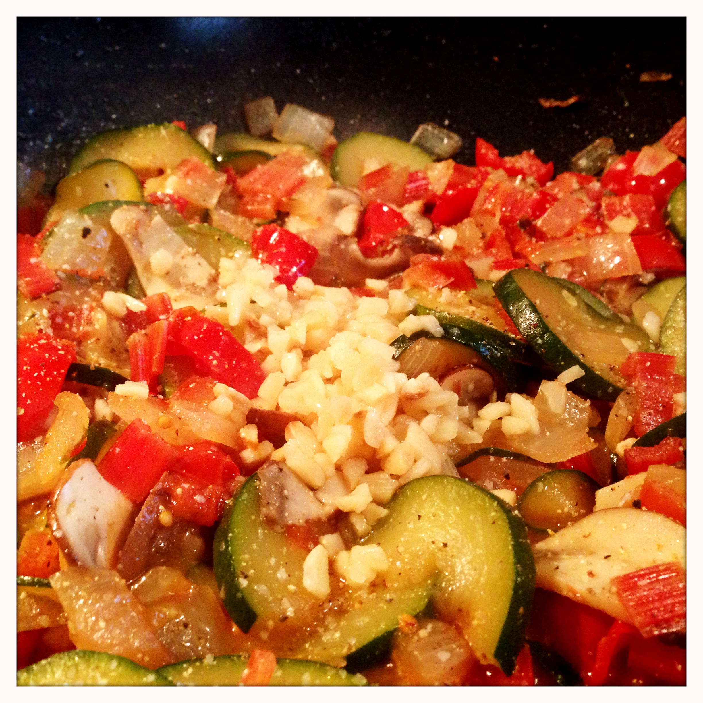 Cook a few minutes more before adding the mushrooms and the tomatoes. Then add the garlic, season with salt and pepper and cook a few minutes until the smell of the cooking garlic starts to fill the kitchen.