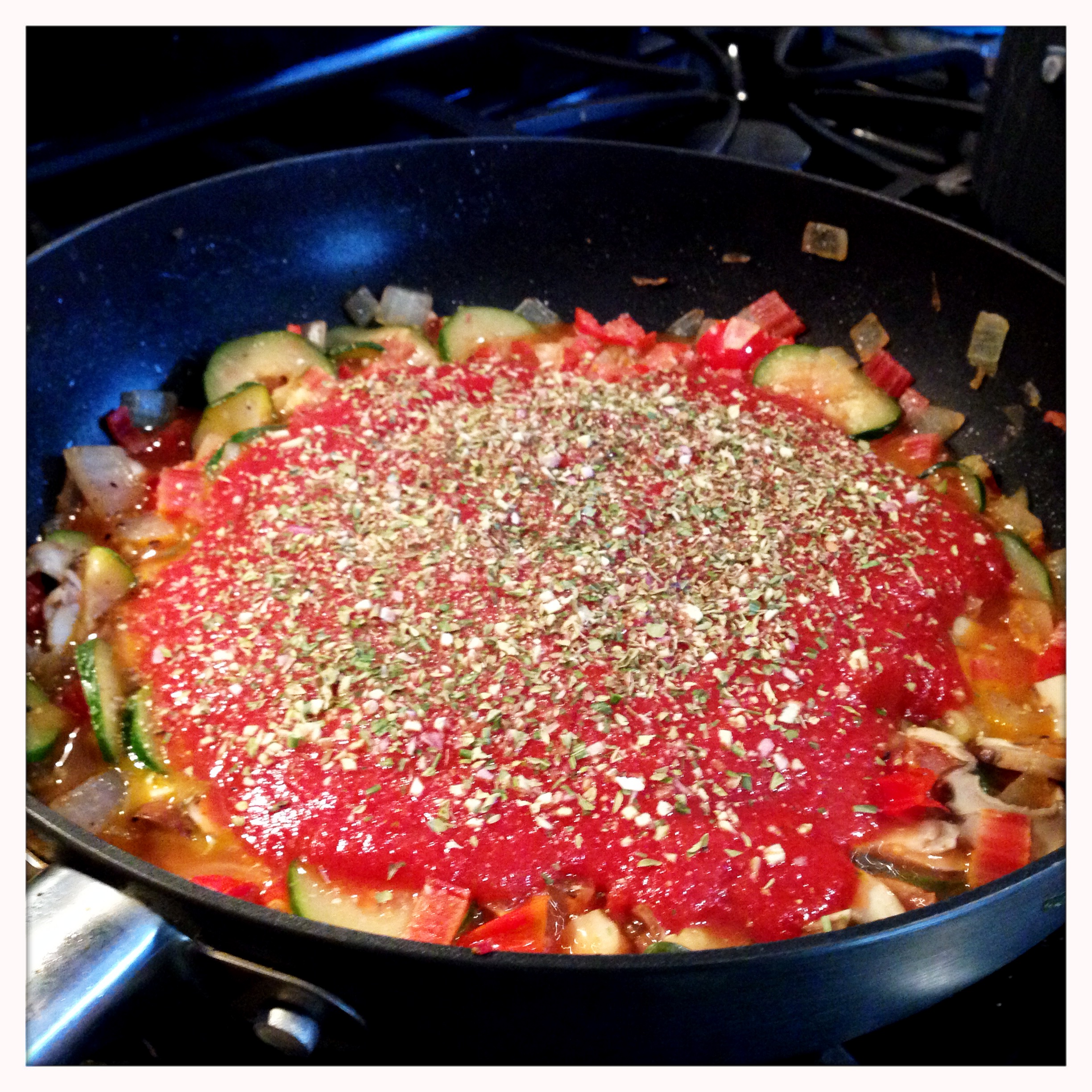 Finally, add the strained tomatoes and a healthy dose of your favorite Italian herbs (fresh or dried). Add a little more pepper and/or salt to taste if needed.