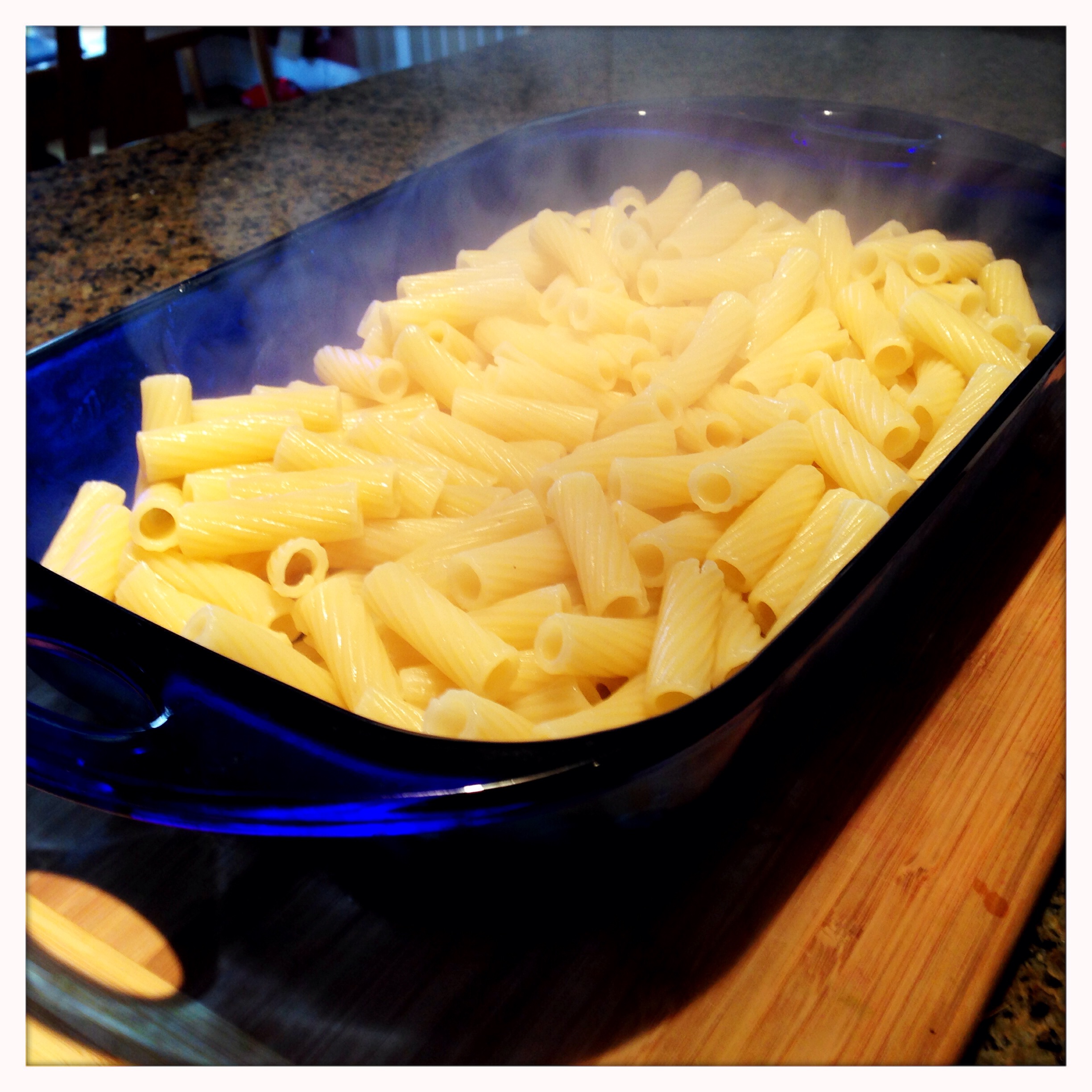 Cook the pasta according to the directions on the package, strain and place into the baking dish.