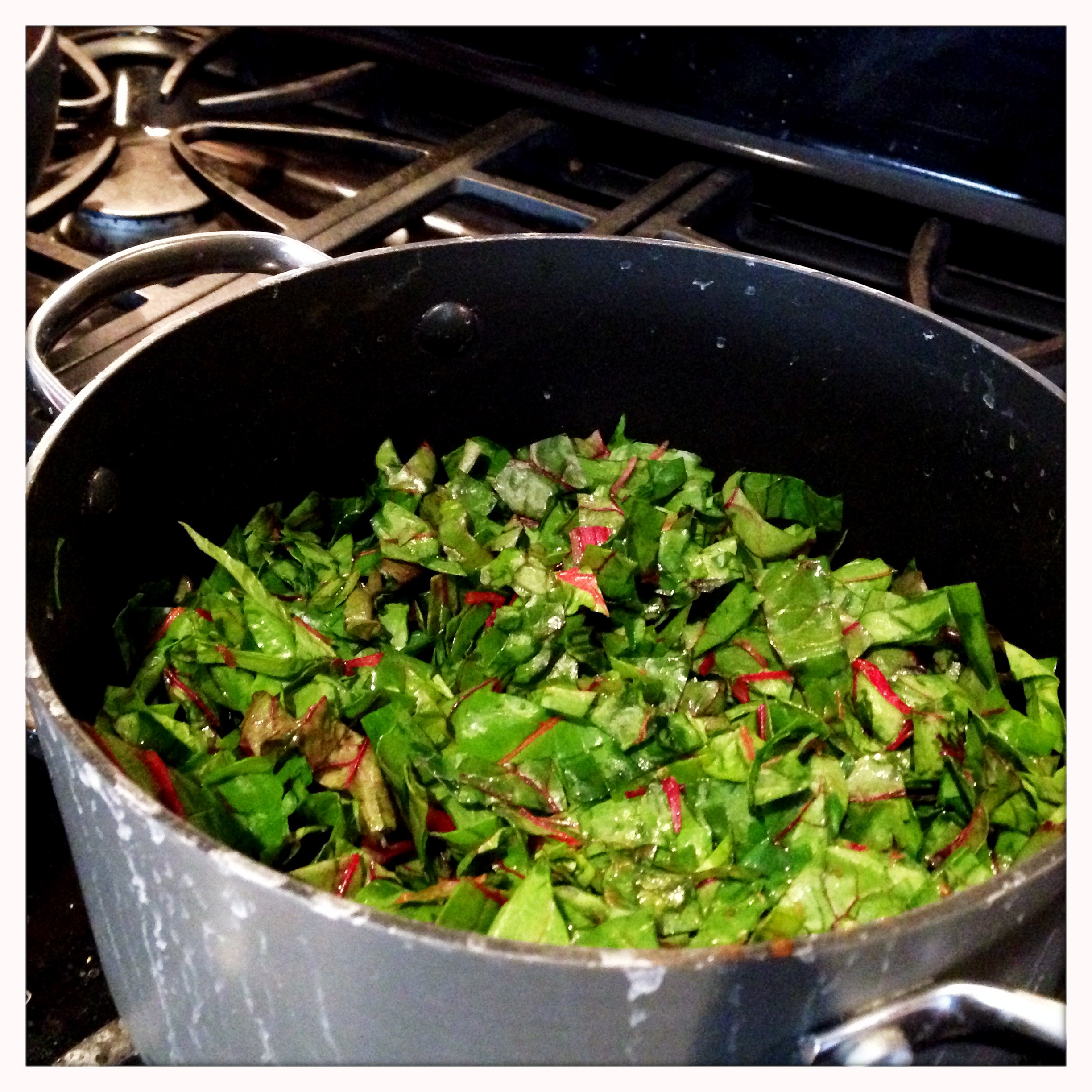 The leaves will soften and turn a brighter shade of green when they’re ready. Then add the chard to the sauce, and stir to evenly distribute.