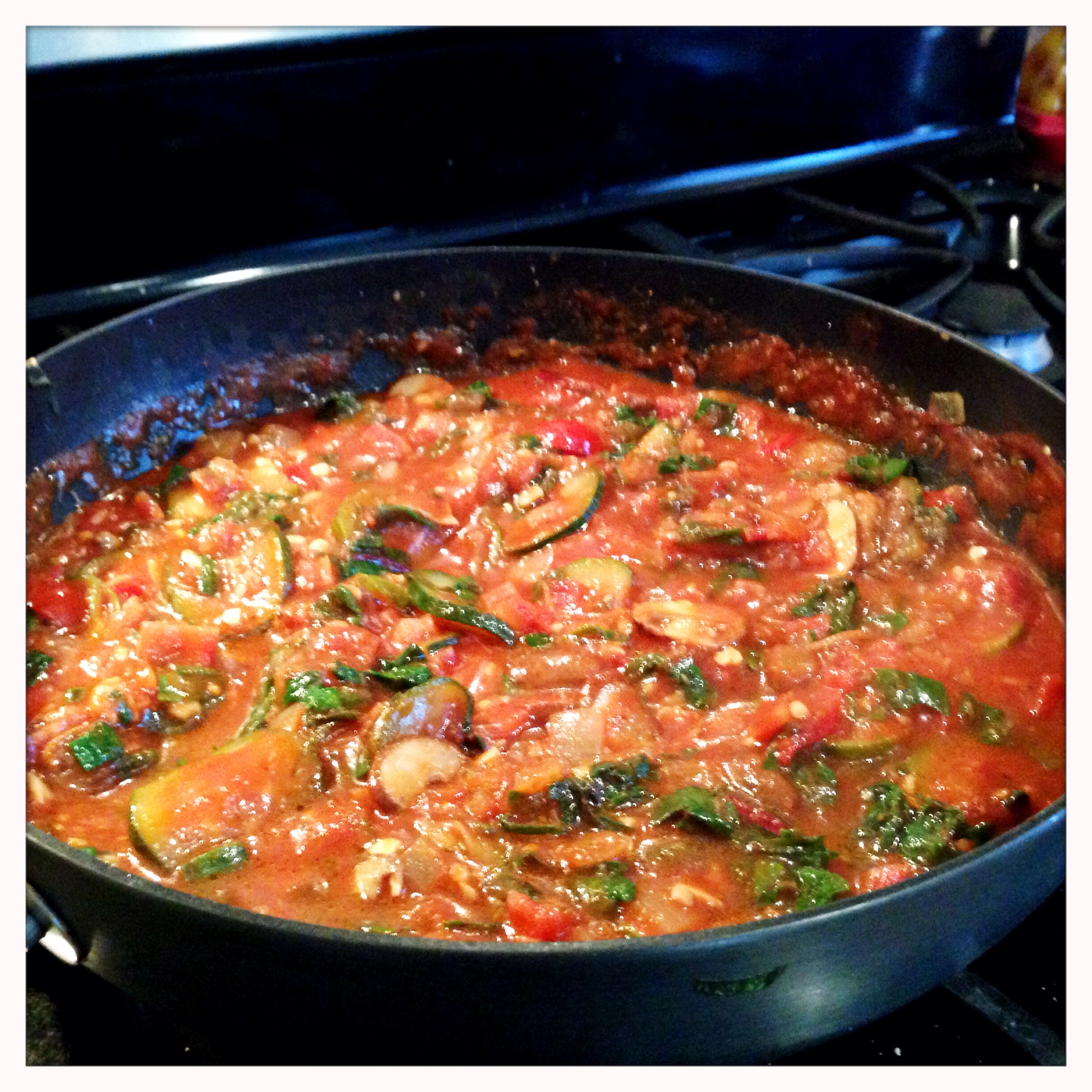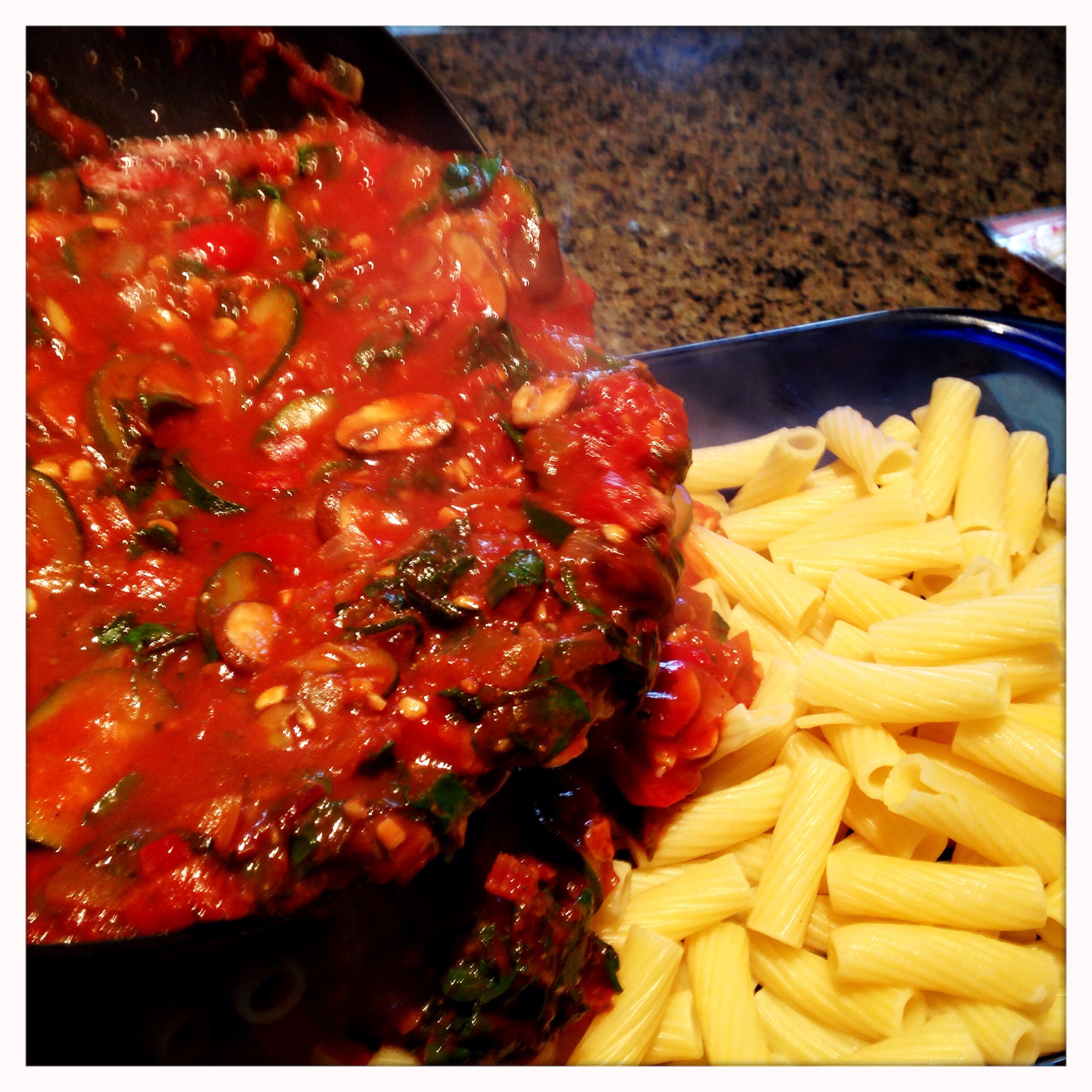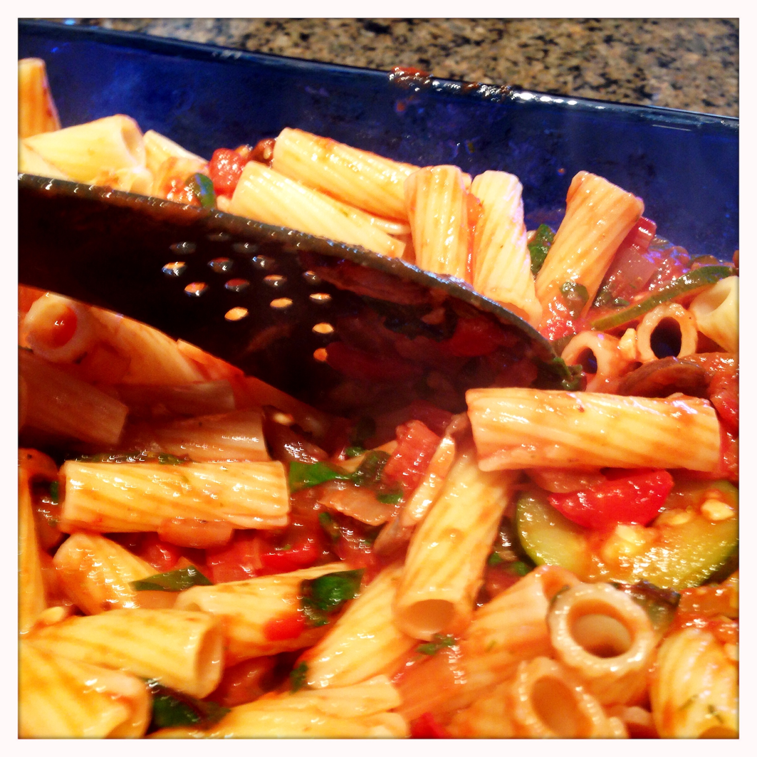 Gently turn the pasta over a few times with a spoon to make sure the sauce and veggies are spread throughout the noodles.