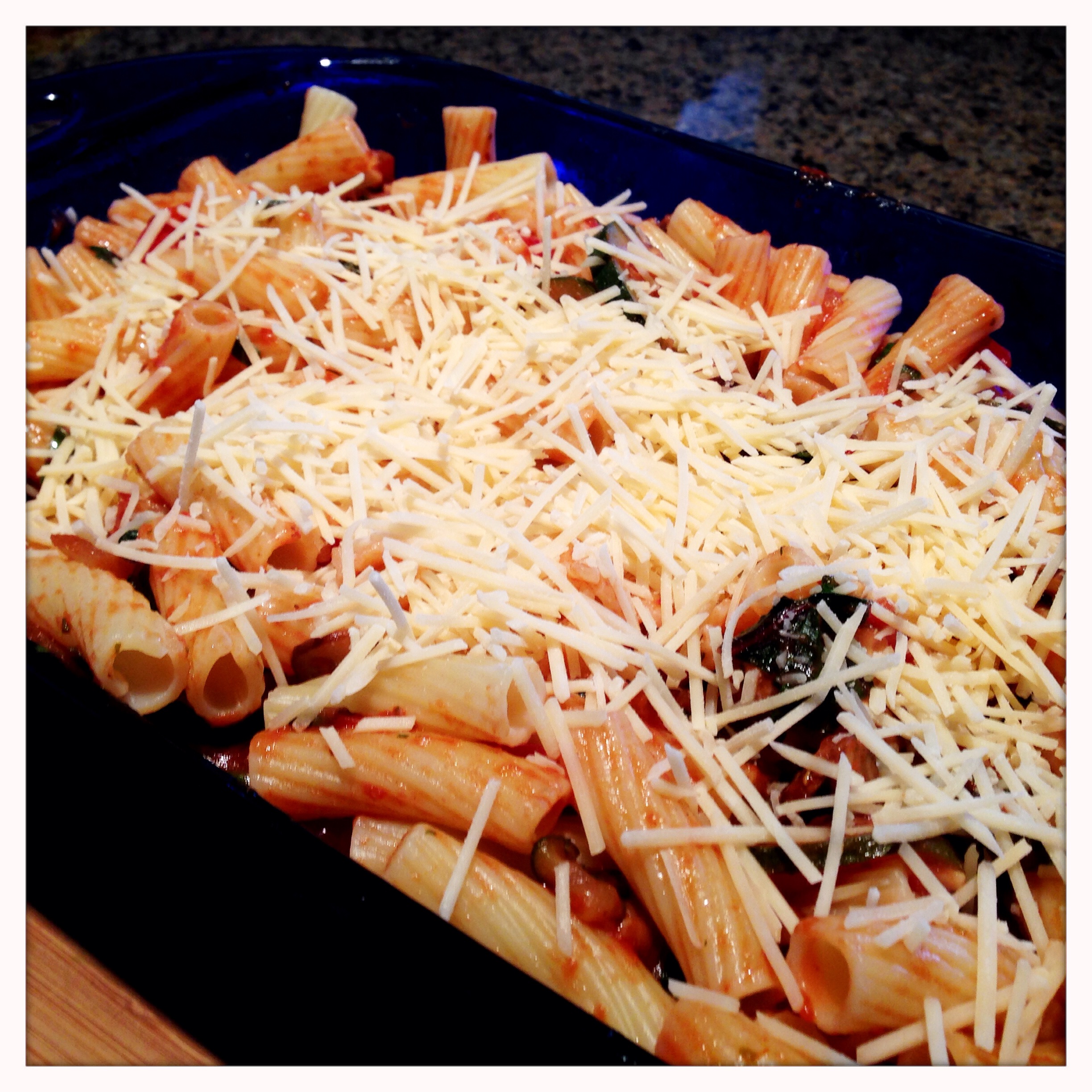 Let the pasta bake for about 30 minutes. Time is not too important here, as everything is already cooked, but you want to allow ample time for the cheese on top to start to caramelize and set.