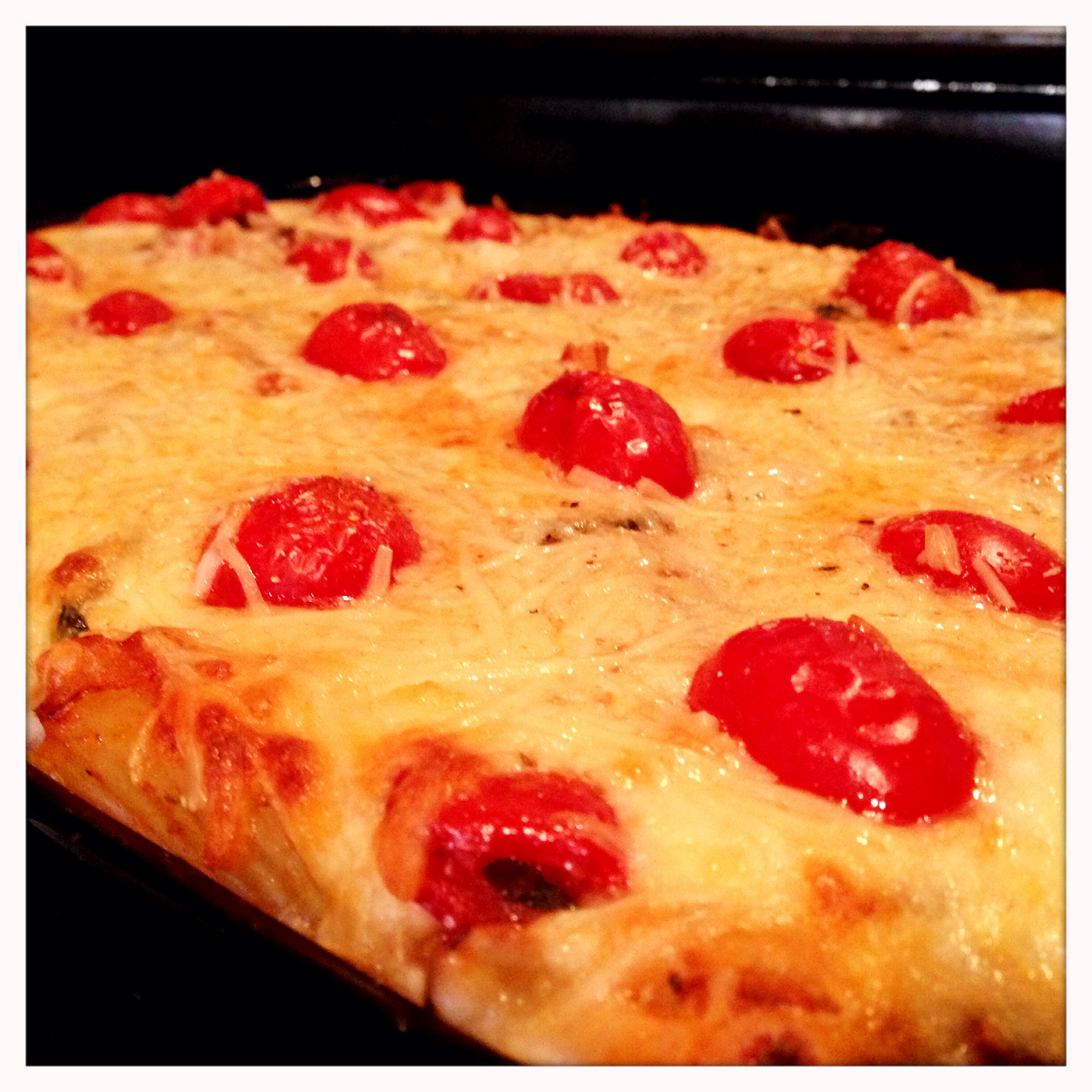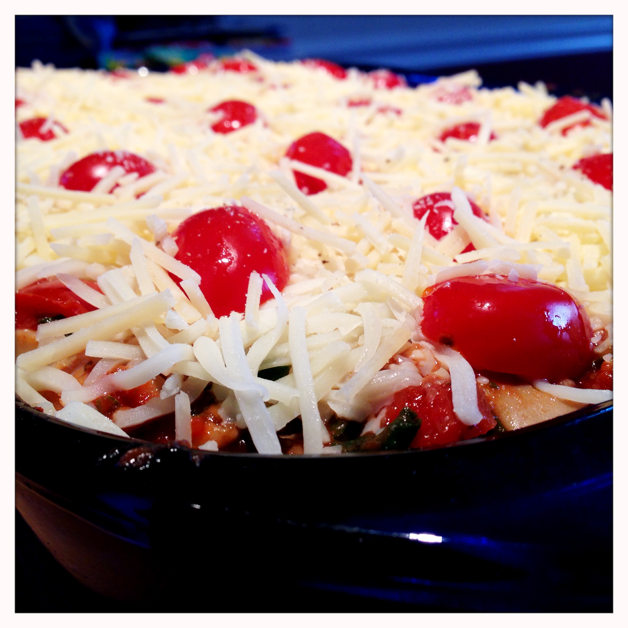 Finally, cover the pasta with the mozzarella and the remaining parmesan. Top with the halved baby romas, and place into the preheated oven.