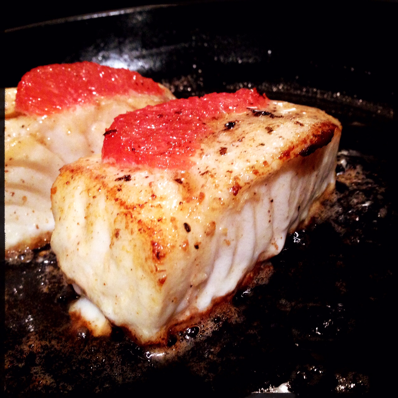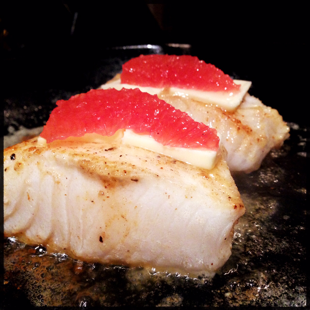 Heat butter in your skillet over a medium high flame. Once the butter is melted and no longer bubbling, add the fish. Cook until the edges start to brown, which should only take a few minutes, so watch carefully. Then flip the fish, add two pads of butter and a grapefruit segment to each piece of fish.