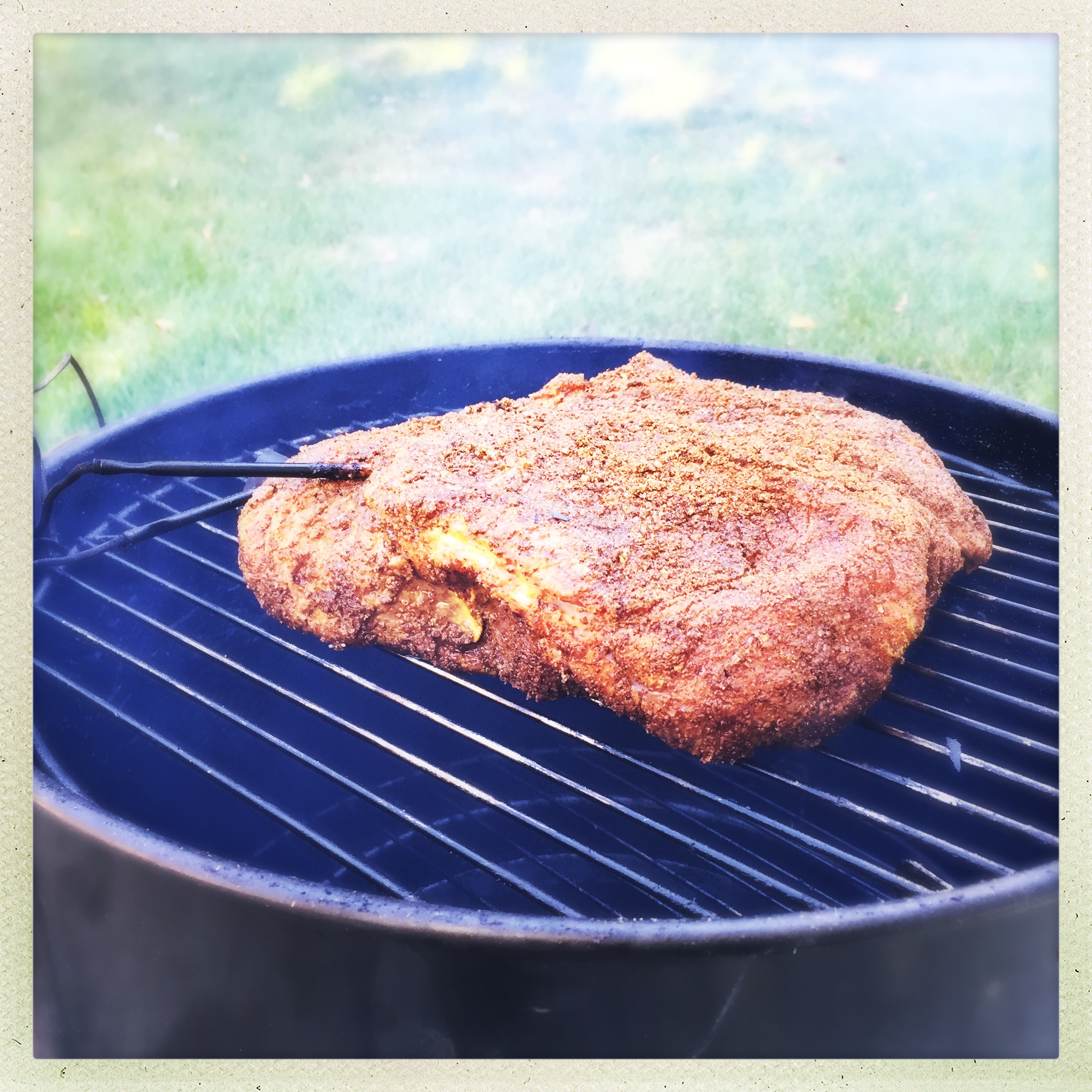 I coated the meat on all sides, including into the crevices, with a moderate amount of rub. Not quite as thick as I do on my pork, but still covering all surfaces with at least some of the spice rub.