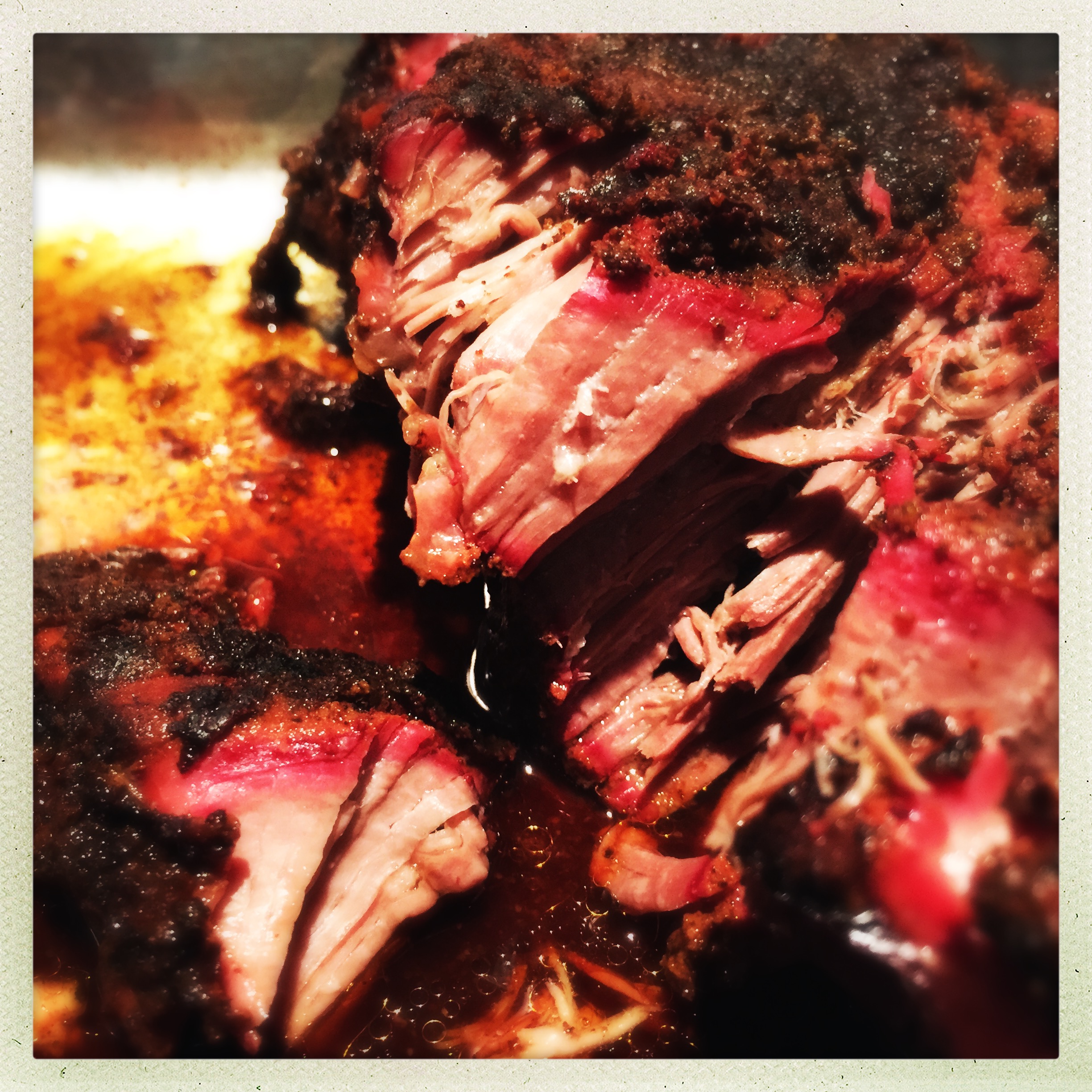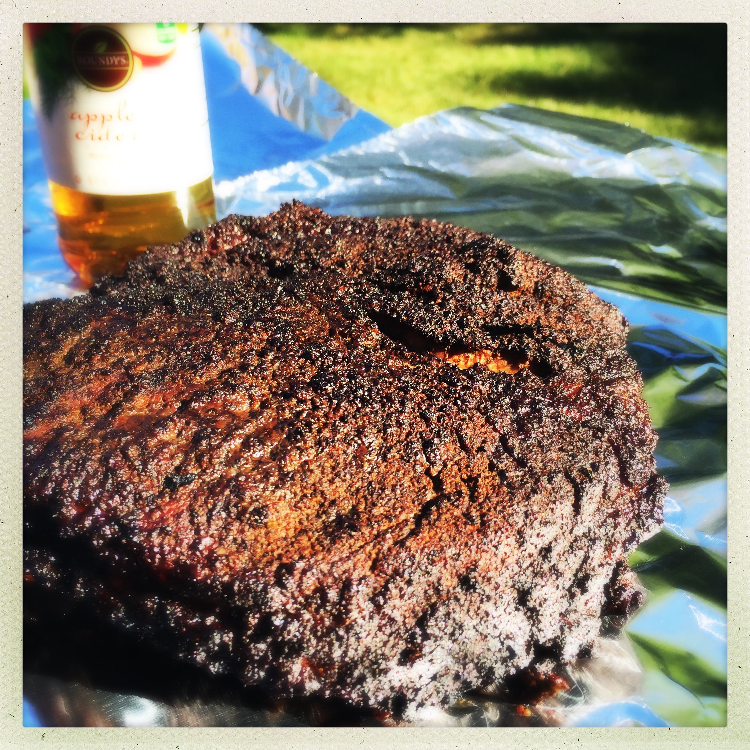 A nice layer of bark had already formed on the meat. I added a splash of cider vinegar and a bigger splash of cherry juice, wrapped it up tight, and got it back in the smoker. I added a few more coals to keep the temp up, and no more wood chunks as the smoke doesn’t penetrate the foil pack. The benefit of foiling is that it prevents the meat from blackening too much, and the liquid braises the meat for the final portion of the cook, helping keep it tender and juicy.