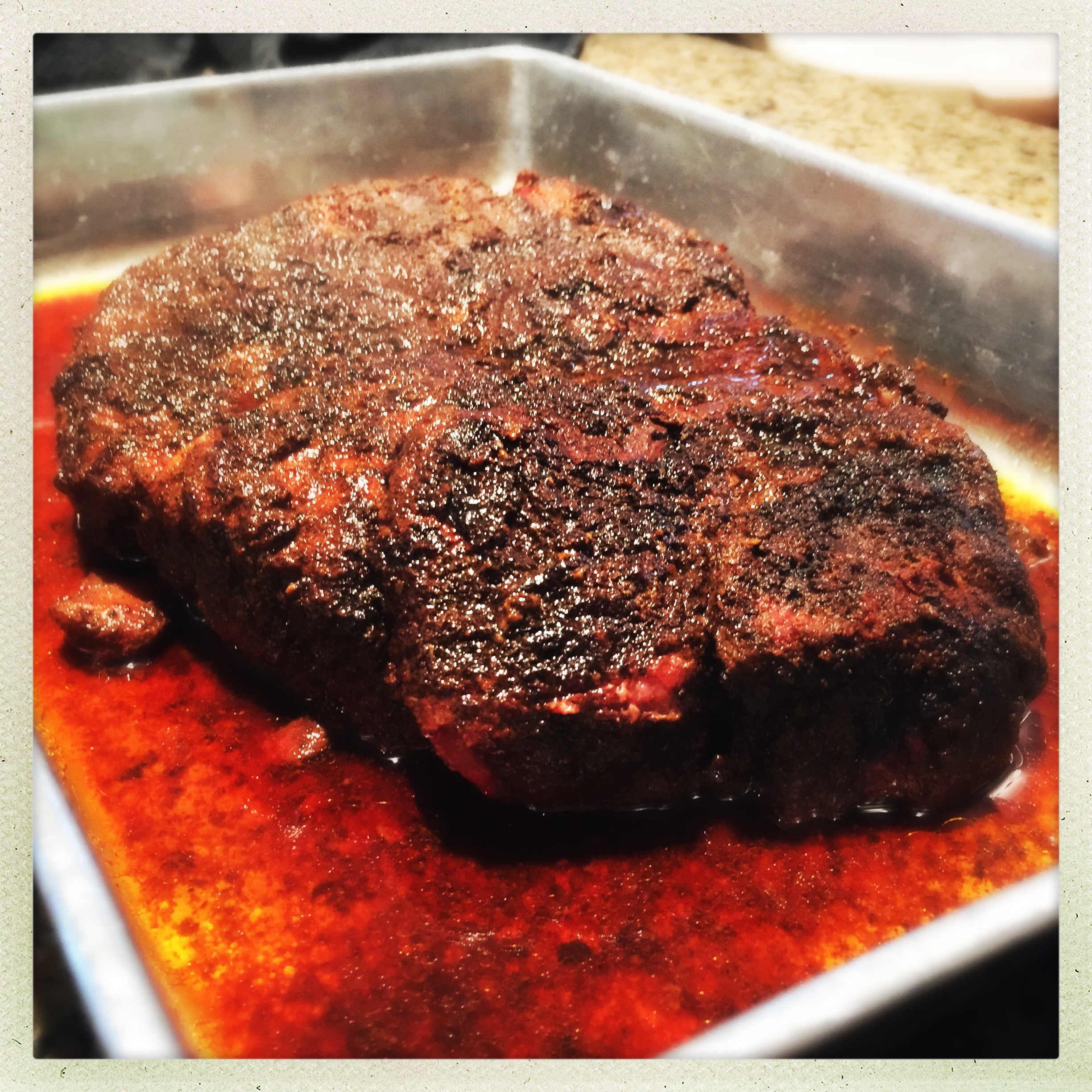 I prepped the meat exactly the same as a pork shoulder, with a few minor adjustments. My basic BBQ rub is 2 parts Old Bay, 1 part raw sugar and 1 part fine ground coffee. For the beef, I wanted a little less sweetness, so I went with about half as much sugar as usual, and bumped up the coffee a bit.