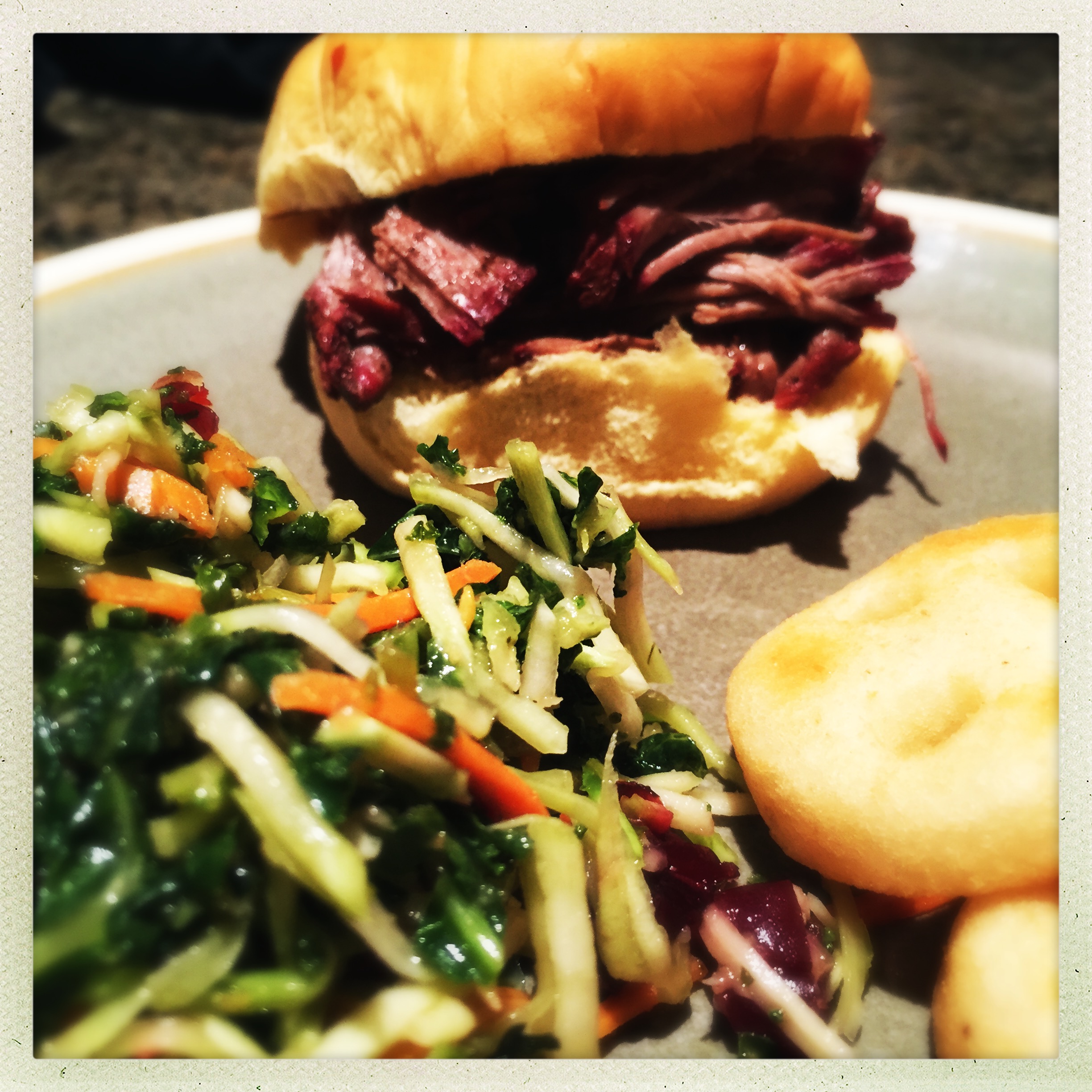 I had my sandwich with some mashed potato “smiles” (which are incredible) and a kale/broccoli slaw. I’m already looking forward to the leftovers and all the things I can do with them. One of my favorite leftover BBQ pork meals is making tacos, and this pulled beef would work perfectly in taco.