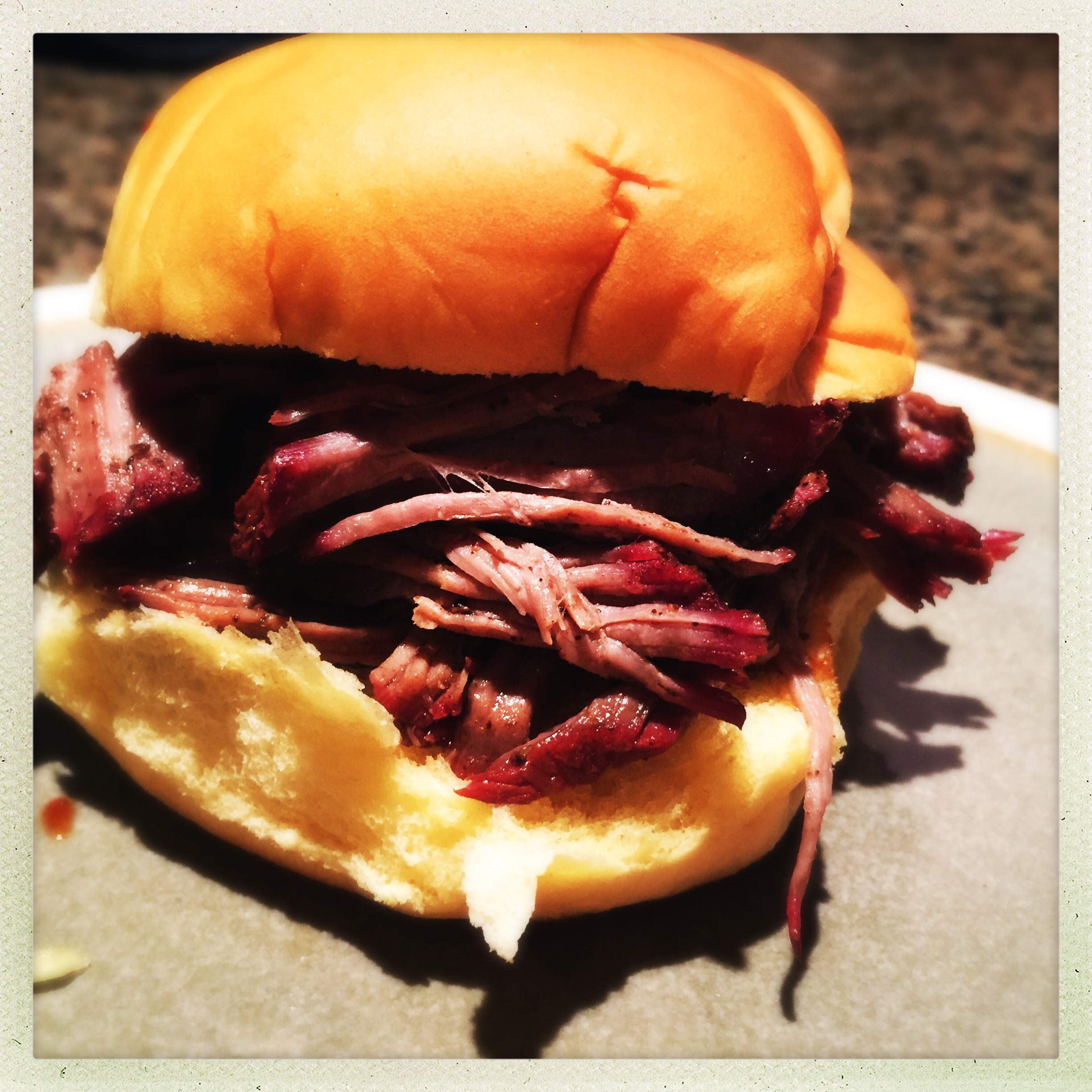 The end product had a lot of similarities to my usual pulled pork, but also a lot of differences. I can’t say one is better than the other, but this was an experiment I definitely plan to repeat. It made for a fantastic sandwich, with and without additional sauce.